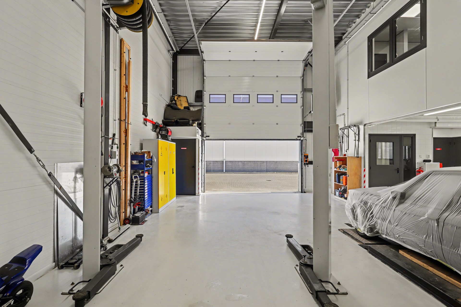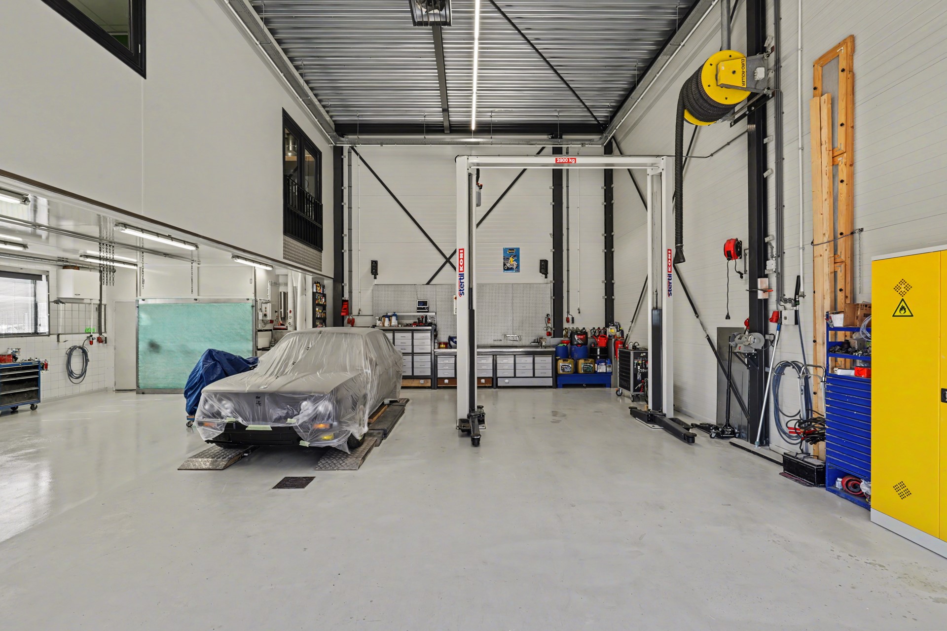 Daarnaast zijn aanwezig: een compressor met droger, een spuitwand, een werkbank met afzuiging in de spuiterij en een voorbereiding voor een lichtstraat. Op de bovenverdieping bevinden zich een keuken-/kantine-/kantoorruimte, extra magazijnruimte en een aansluiting voor lucht en 1x 380 volt.