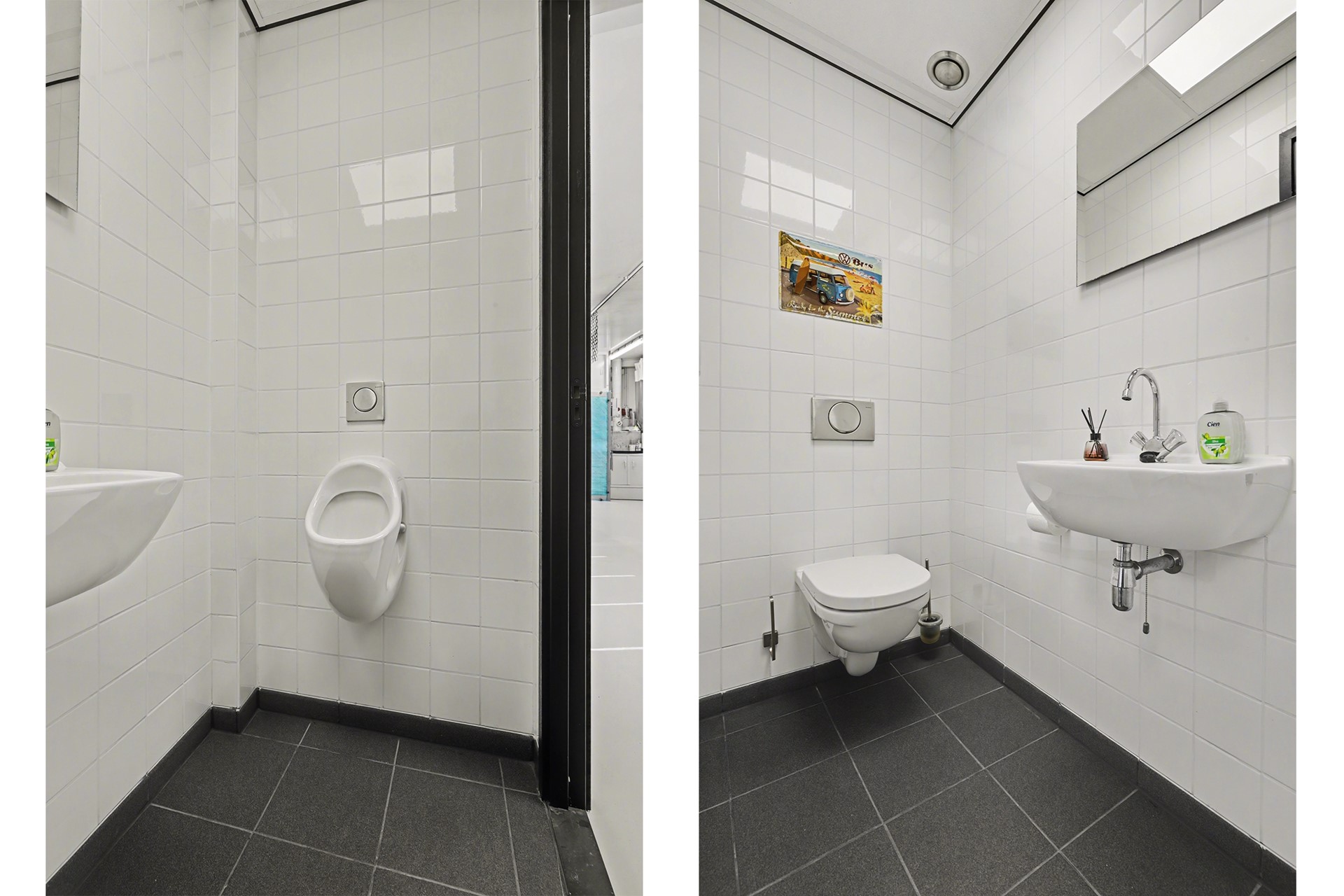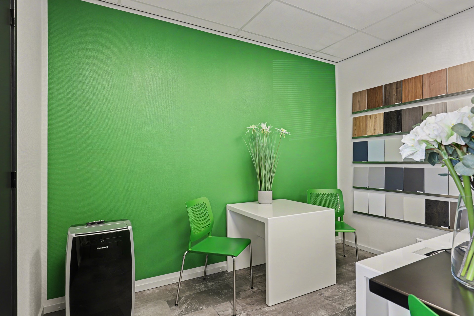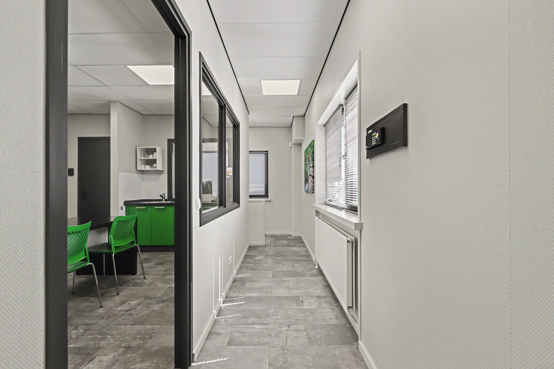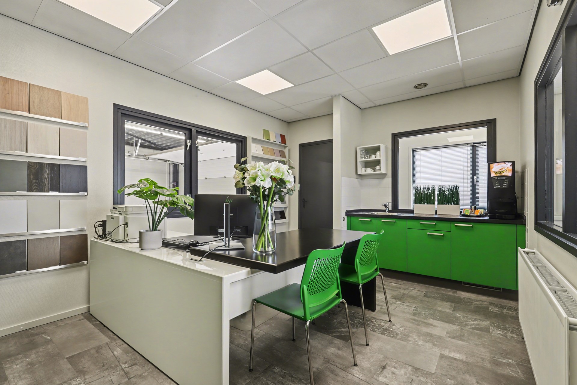 Ook het kantoor en de overige ruimten zijn praktisch uitgerust, onder meer met centrale permanente afzuiging in kantoor en toilet met afstandsbediening, jaloezieën, een inpandige brievenbus, een sleutelkluis en diverse inventaris, waaronder bureau’s, stoelen en magazijnrekken.