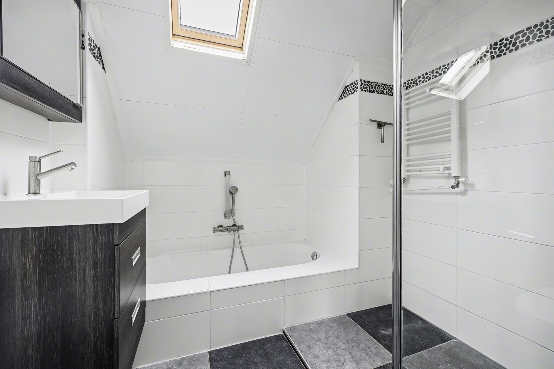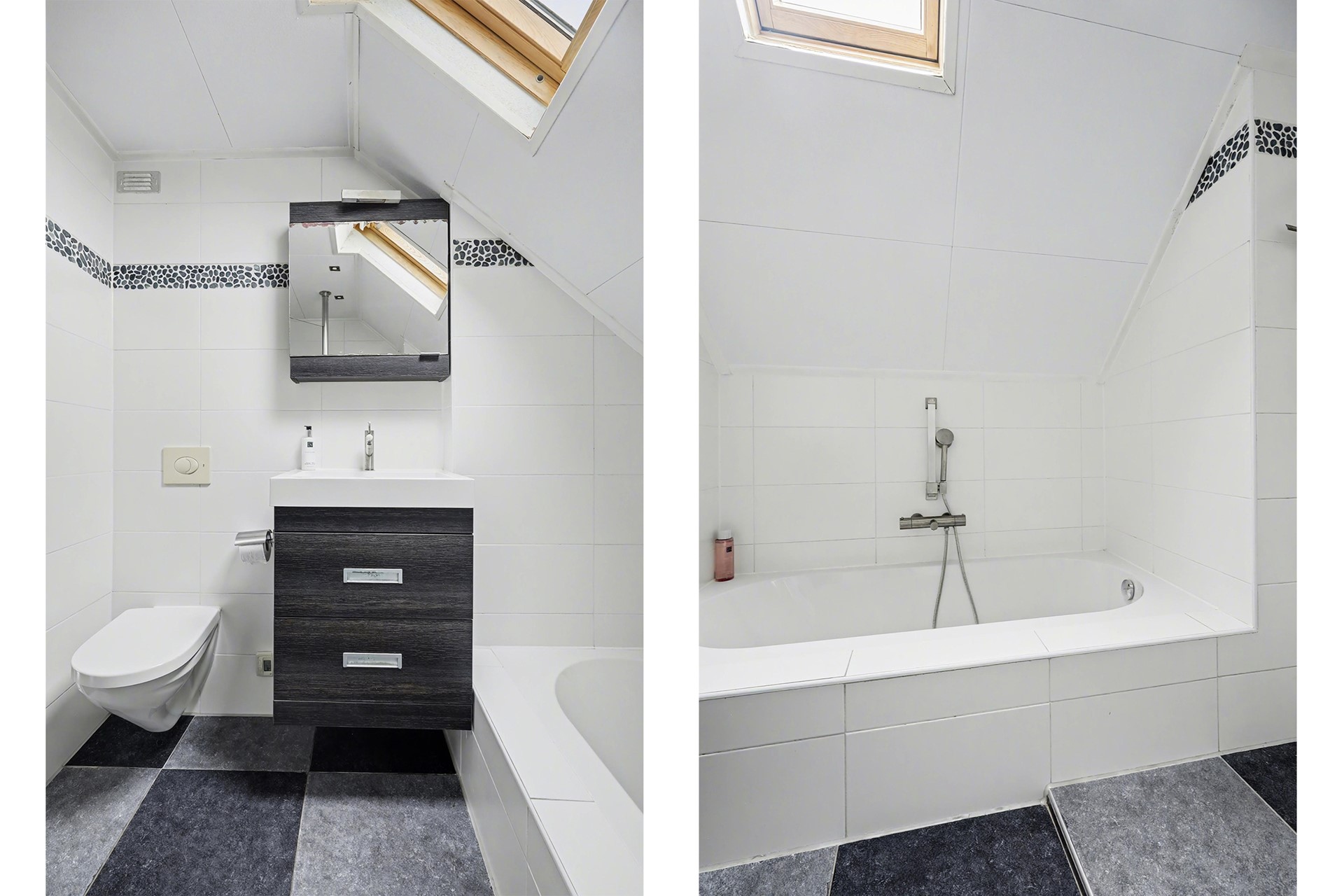 Op de eerste verdieping is de indeling als volgt: overloop, 3 slaapkamers (462 x 321, 321 x 312 met hardhouten dakkapel en 362 x 193) en de badkamer (255 x 202) met ligbad, inloopdouche, 2e toilet (wandcloset) en badkamermeubel met wastafel.
