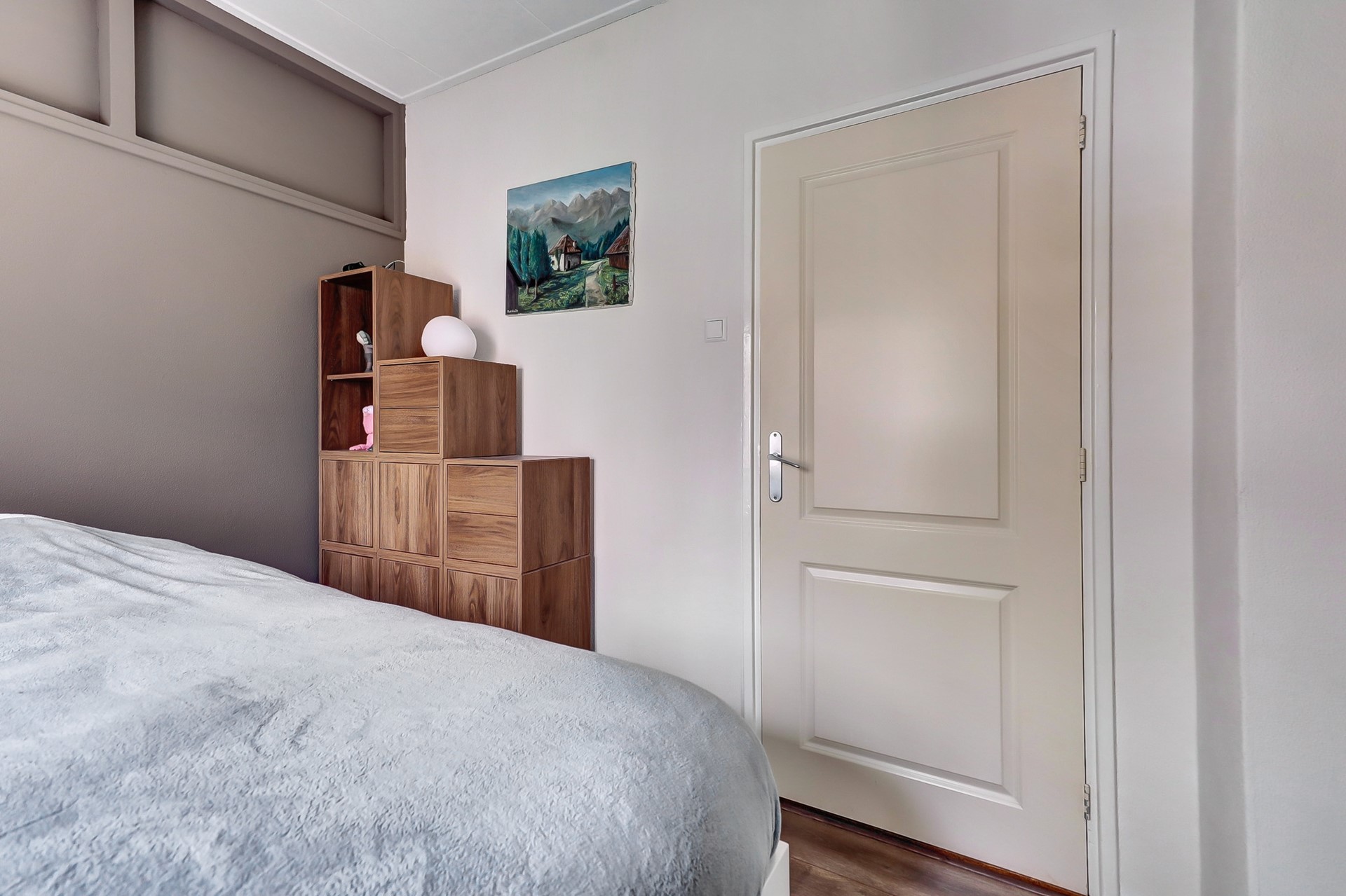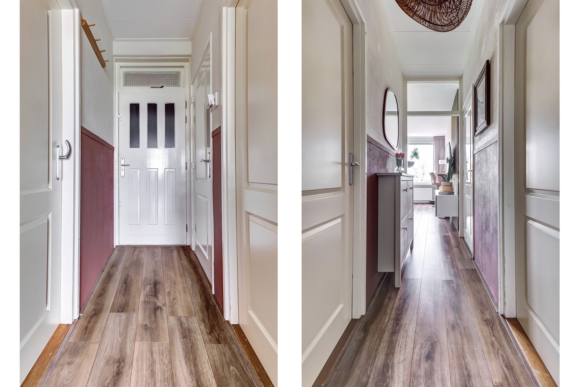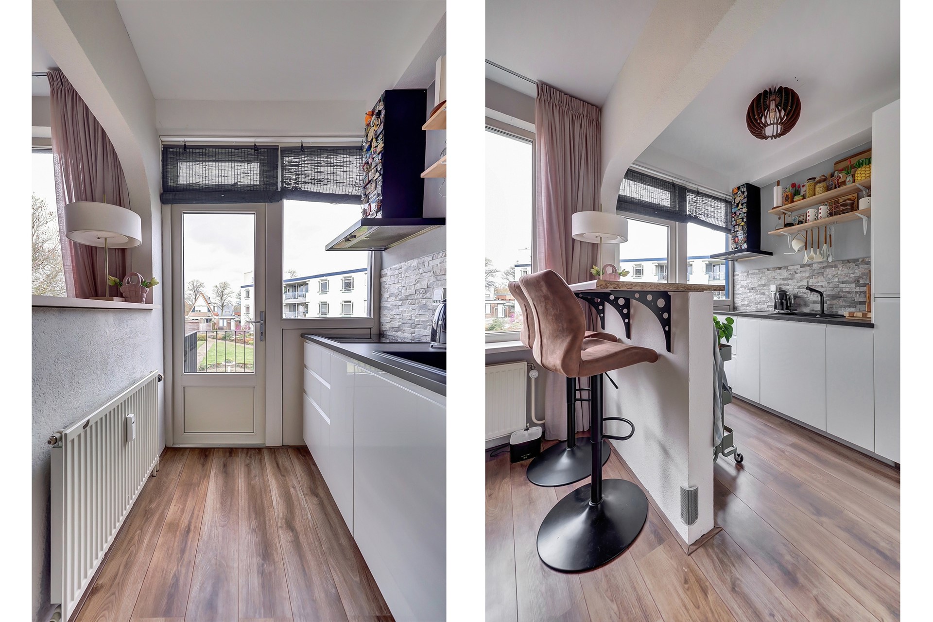 De indeling is als volgt: entree/hal met meterkast, grote slaapkamer met kastenwand aan de linkerzijde, de kleine slaapkamer aan de rechterzijde en de luxe badkamer met toilet, douchecabine, designradiator en badkamermeubel met wastafel eveneens aan rechterzijde. Recht vooruit betreedt u de lekker vierkante woonkamer met grote raampartijen en toegang tot de open keuken met nette inbouwkeuken. Tussen de woonkamer en de keuken bevindt zich een eetbar. in de keuken bevindt zich het warmwatertoestel en er is een deur naar het balkon.