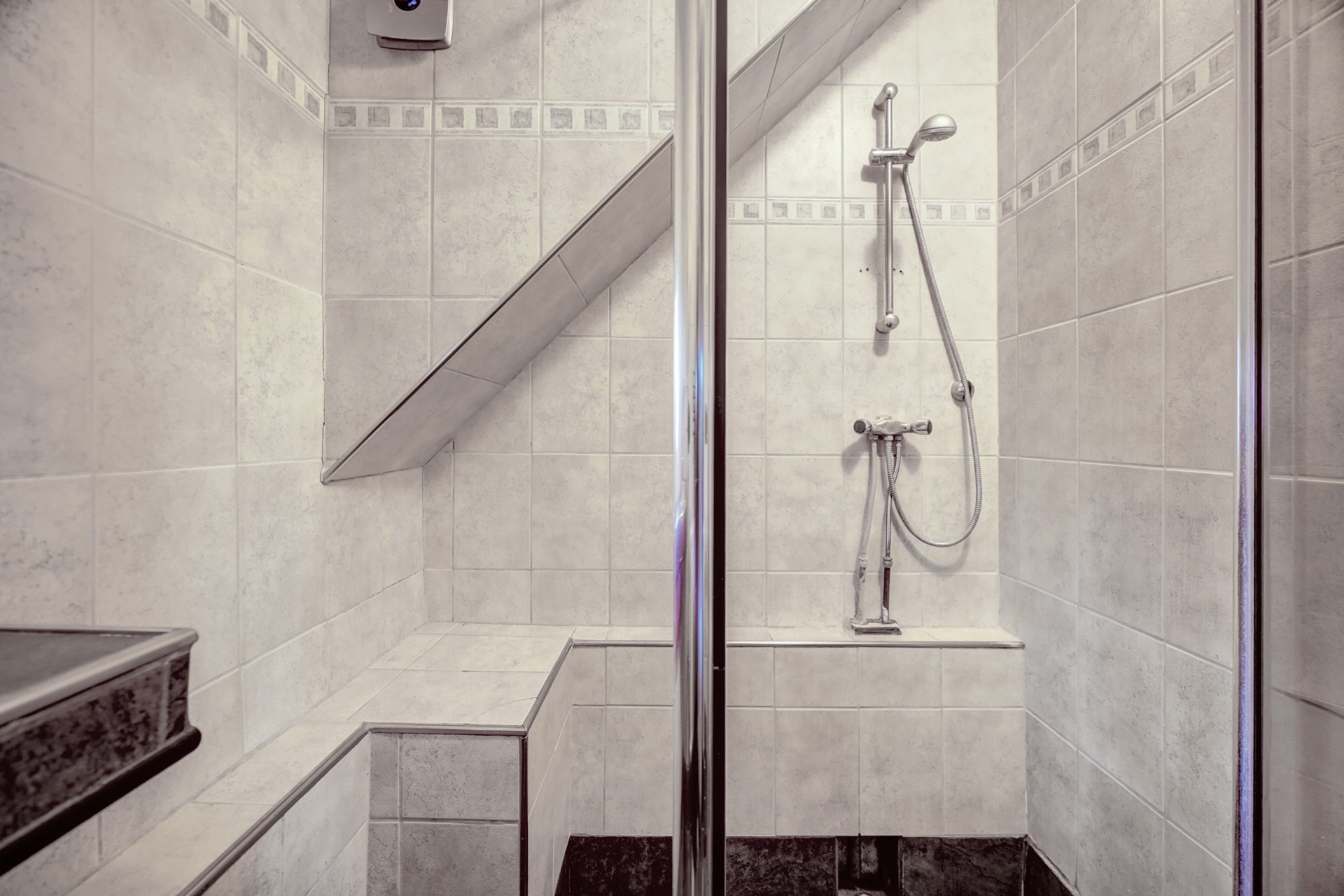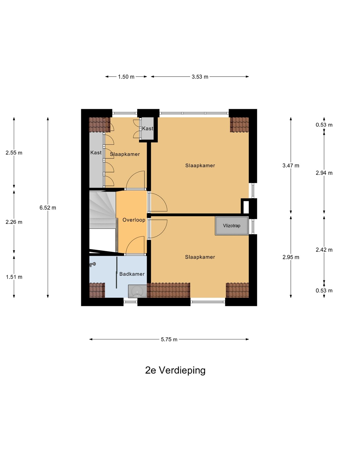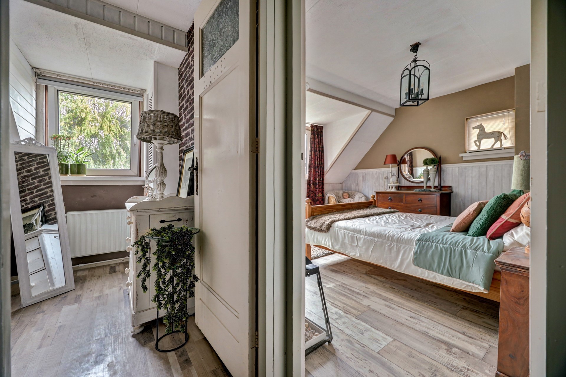 Op de verdieping is de indeling als volgt: overloop, mooie ouderslaapkamer (353 x 347), prima tweede slaapkamer (353 x 295 met trap naar de bergzolder). kleinere derde slaapkamer (255 X 194 met vaste kasten) en nette doucheruimte (194 x 151) met douchegelegenheid en wastafelmeubel.