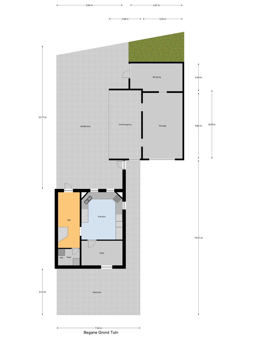 In het souterrain is de indeling als volgt: ruime hal met loopdeur naar de tuin en toegang tot de c.v.-/wasruimte en de woonkeuken (422 x 364 met balkenplafond en keurige hoekinbouwkeuken v.v. -apparatuur) met toegang tot een grote binnenberging (364 x 220).