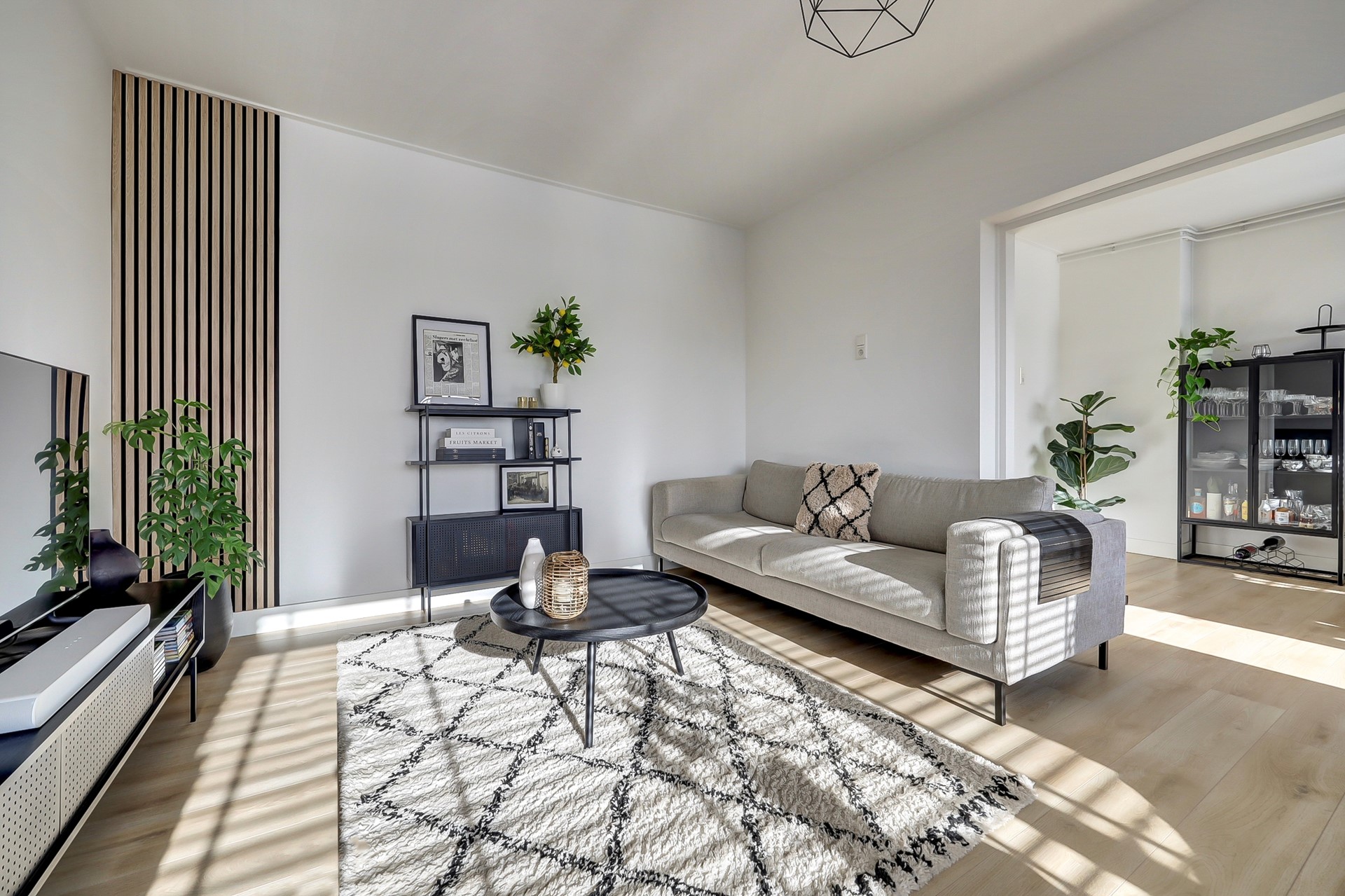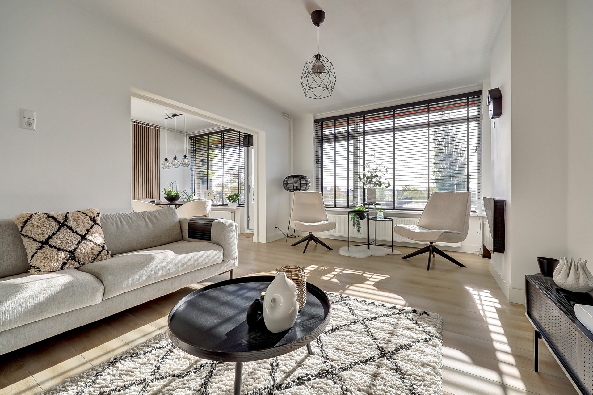de royale, strakke en toch sfeervolle — aan de voorzijde gelegen — woonkamer (ca. 29 m², met laminaatvloer, zonwering, glad gestuukte wanden en toegang tot het zonnige, op het zuiden gesitueerde balkon van 4 m²),