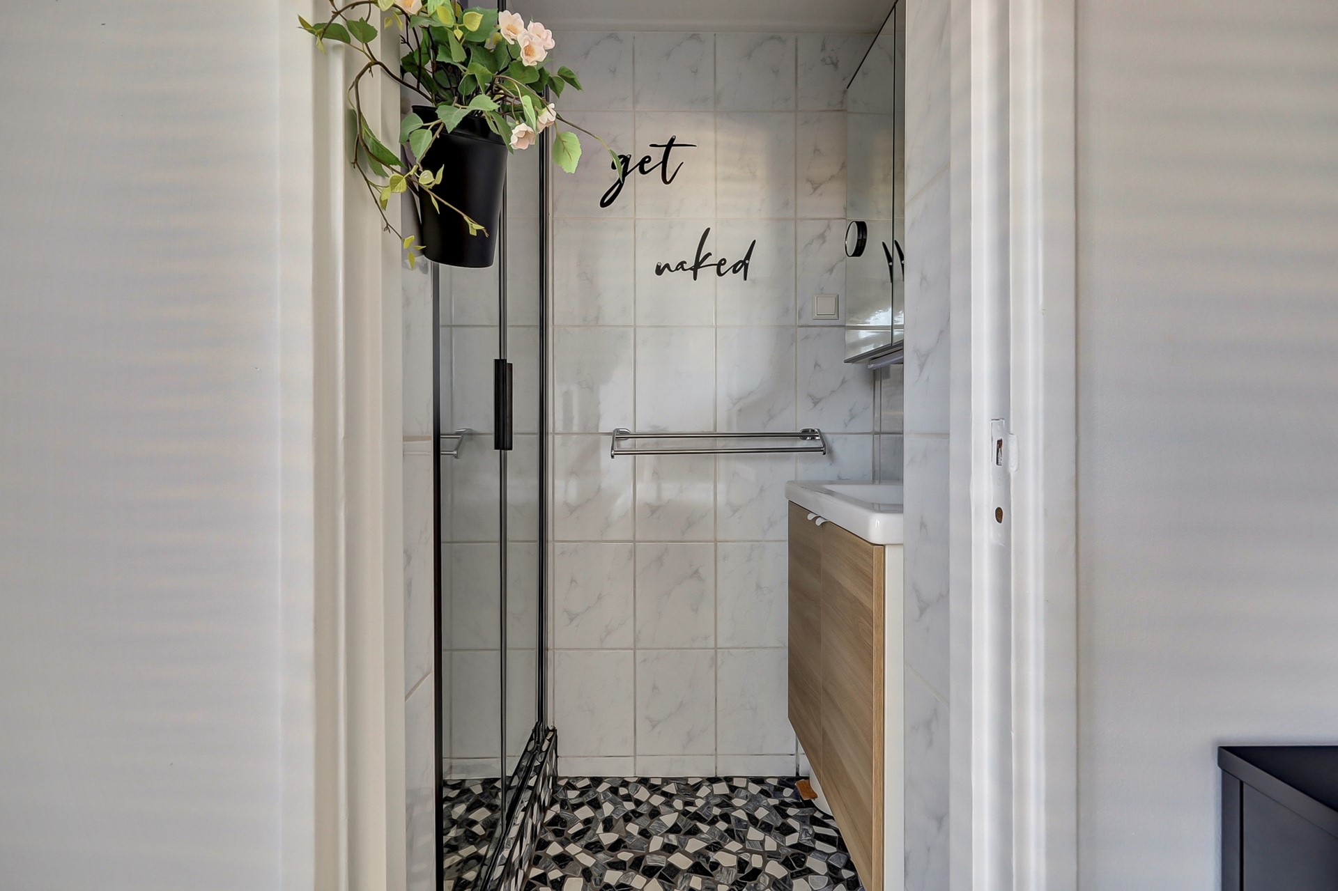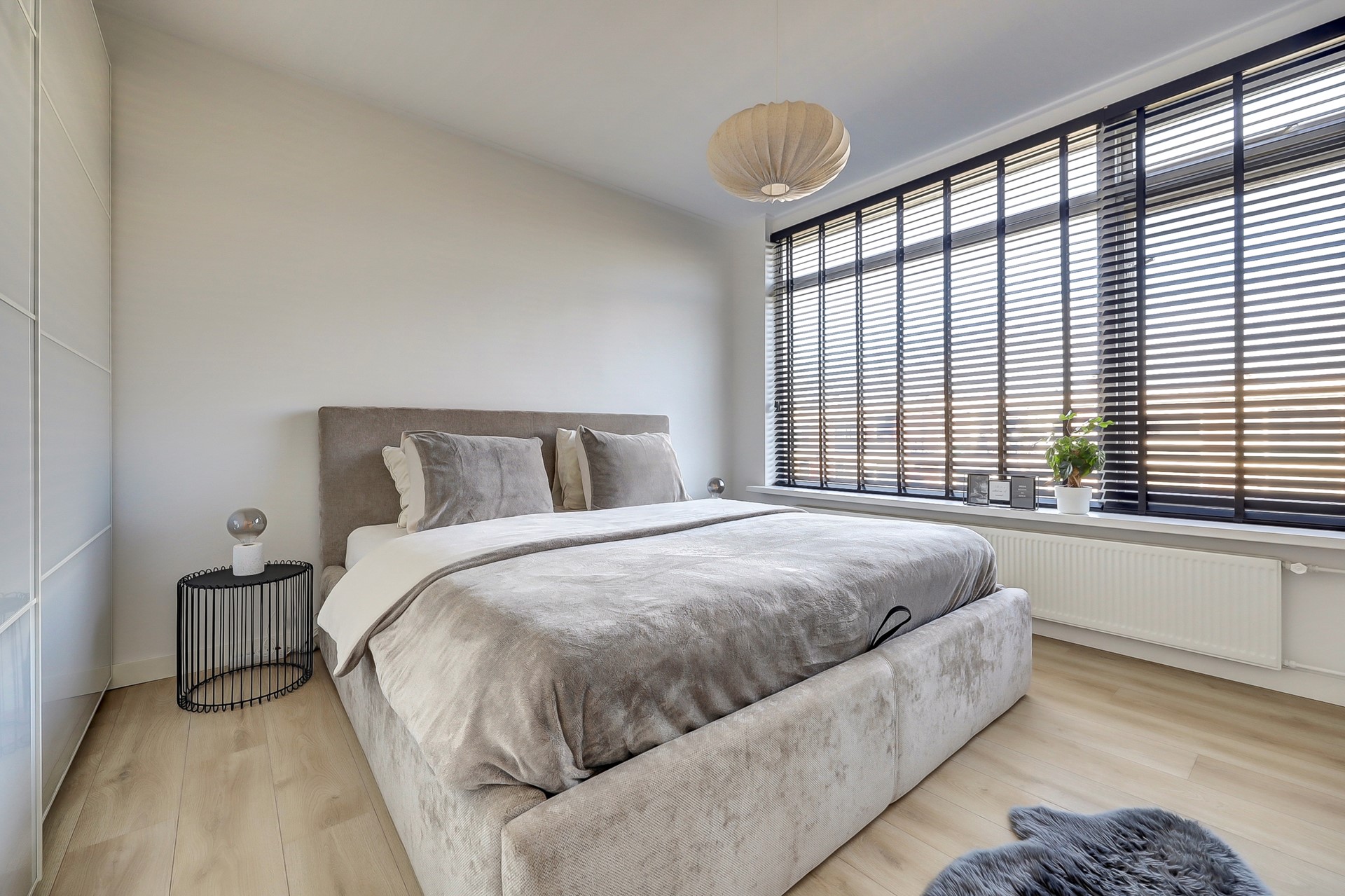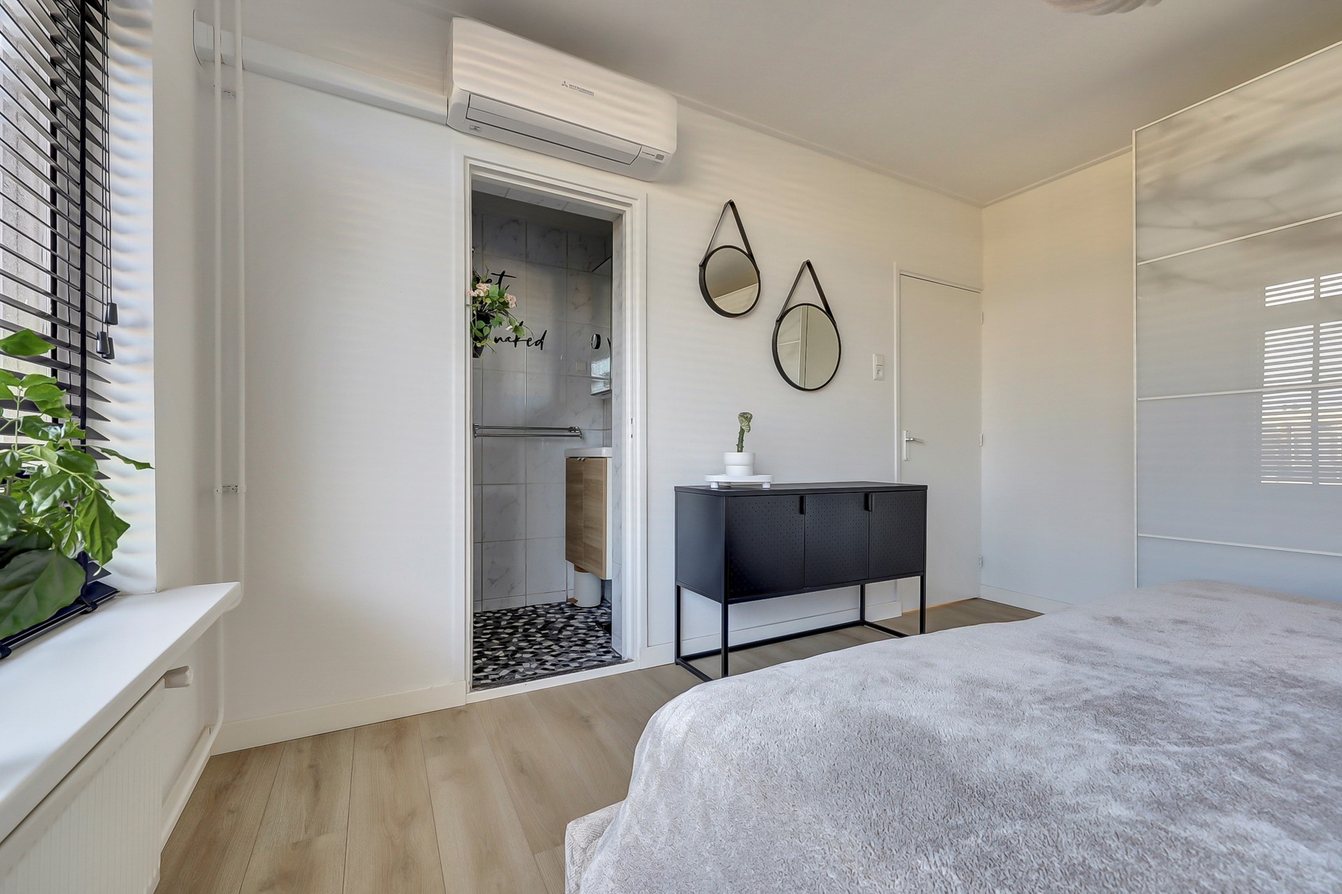 en de heerlijke slaapkamer van 14 m² met laminaatvloer, gestuukte wanden en toegang tot de badkamer (met douchegelegenheid en nieuw badkamermeubel met wastafel).