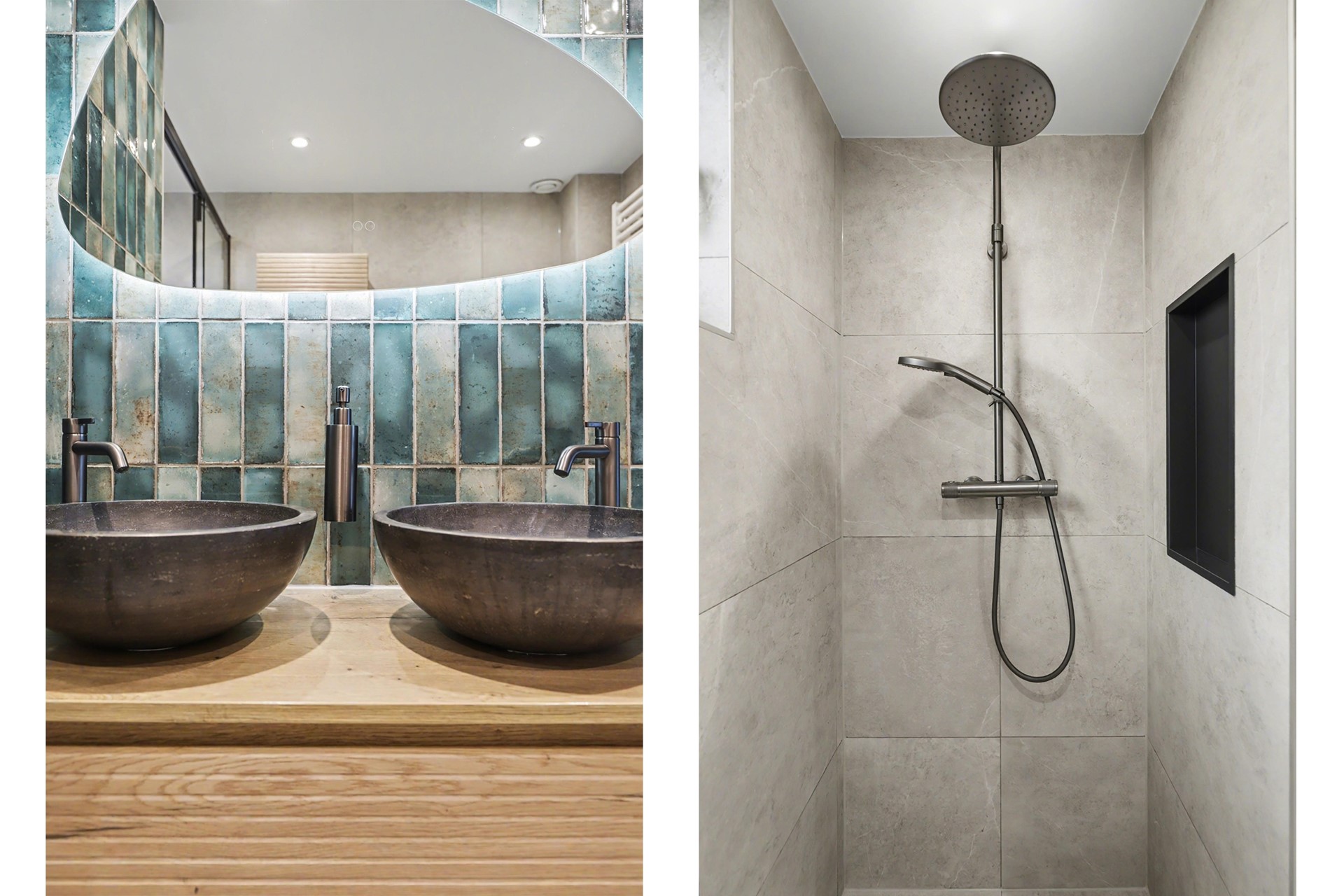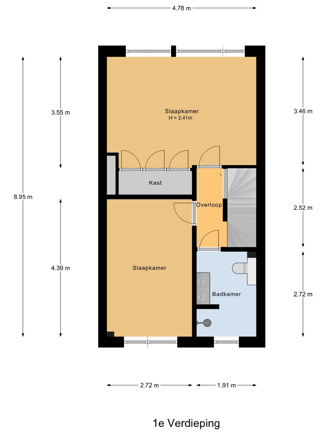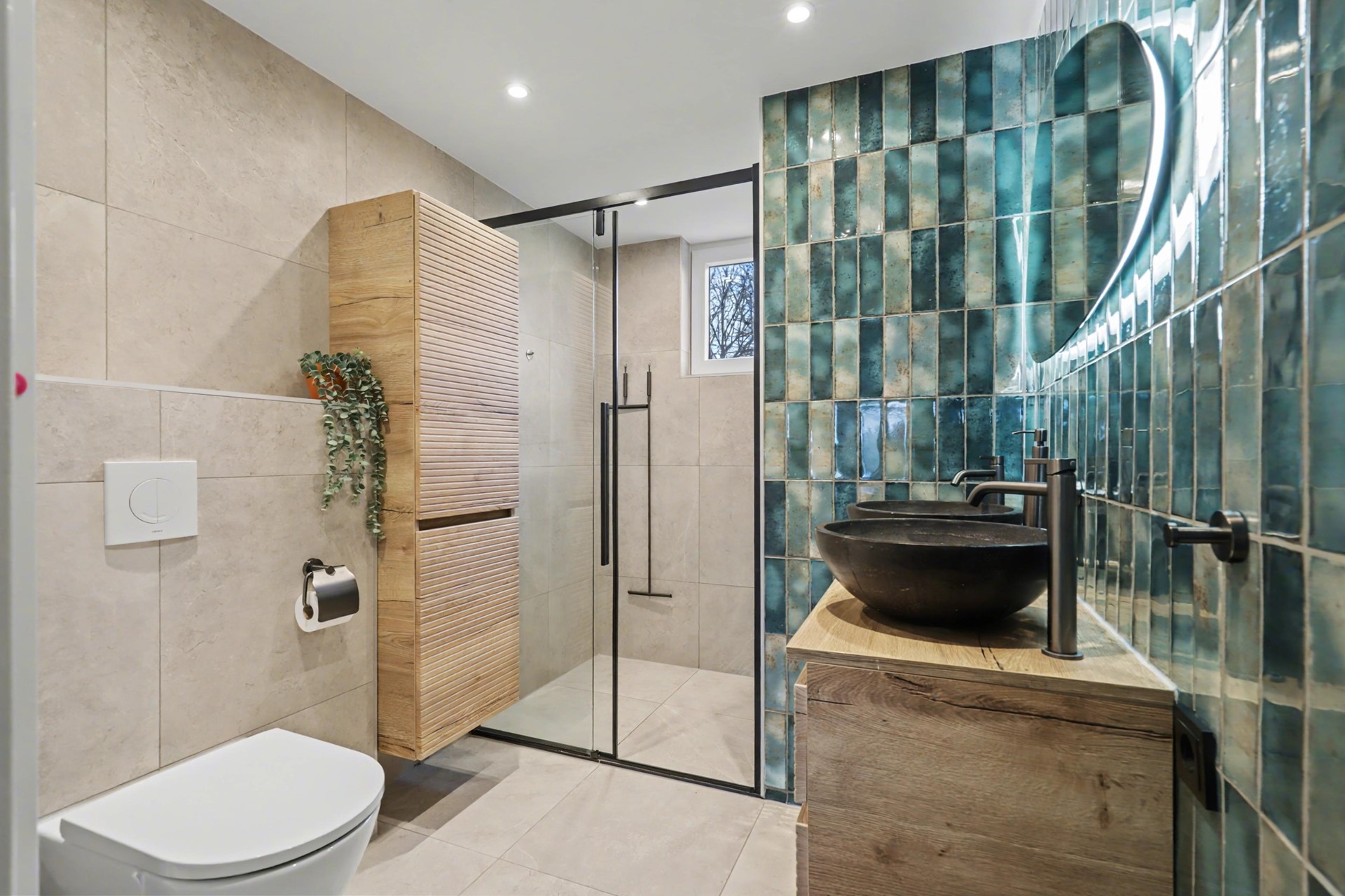 Op de eerste verdieping is de indeling als volgt: overloop, prachtige ouderslaapkamer (475 x 447/346 inclusief de kasten), prima tweede slaapkamer (439 x 2722) en de exclusieve - in 2024 vernieuwde - badkamer (272 x 191) met elektrische vloerverwarming, inloopdouche, tweede toilet en badkamermeubel met 2 wastafels.
