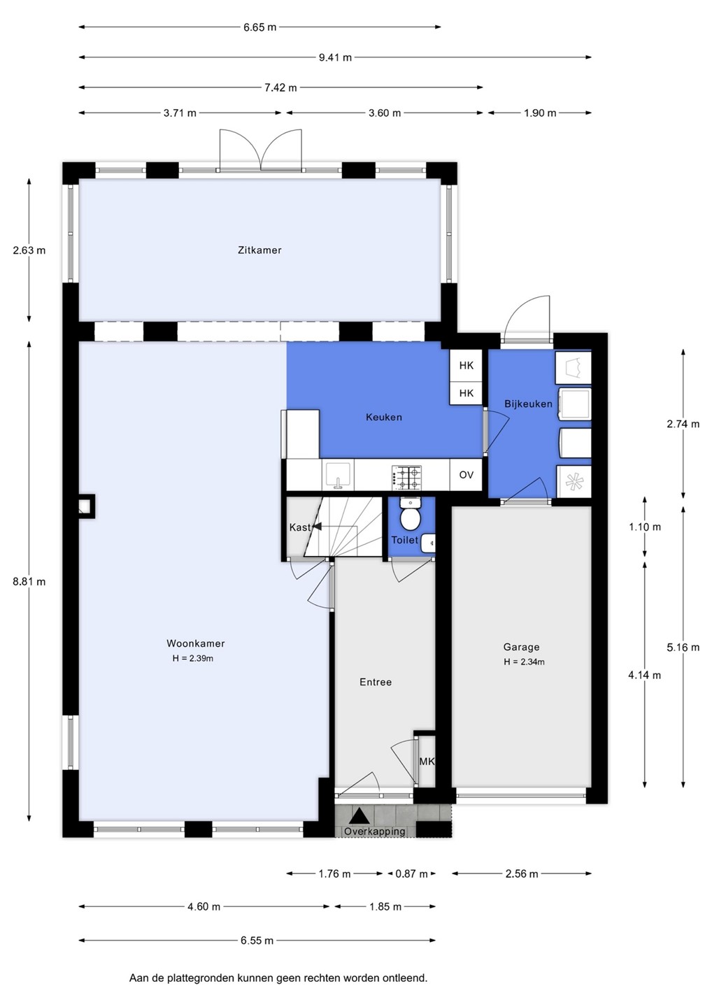 De indeling is als volgt: hal met toilet, meterkast, trapopgang en toegang tot de grote fraaie L-vormige living van 60 m², bestaande uit de oorspronkelijke doorzonwoonkamer, de uitbouw/tuinkamer (met openslaande tuindeuren en aan 3 zijden ramen, waardoor de lichtinval uitzonderlijk groot is) en de ruime eetkeuken met in 2022 geplaatste luxe inbouwkeuken v.v. inbouwapparatuur en natuurstenen aanrechtblad. Vanuit de keuken is er toegang tot de bijkeuken (met aansluitingen en afvoeren t.b.v. de wasapparatuur en een loopdeur naar de tuin en naar de inpandige garage).