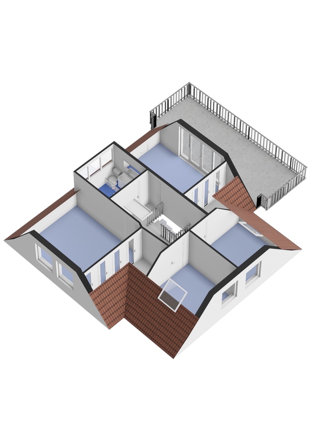 De indeling van de verdieping – die vanwege de dwarskapconstructie en de ruimte boven de garage aanzienlijk groter is dan verwacht - is als volgt: royale overloop, mooie ouderslaapkamer met vaste kast en openslaande deuren naar het dakterras, prima tweede slaapkamer met vaste kasten, leuke derde en vierde slaapkamer en luxe en strakke – in 2019 vernieuwde – badkamer met dakkapel, inloopdouche, designradiator, tweede toilet en badkamermeubel met wastafel.