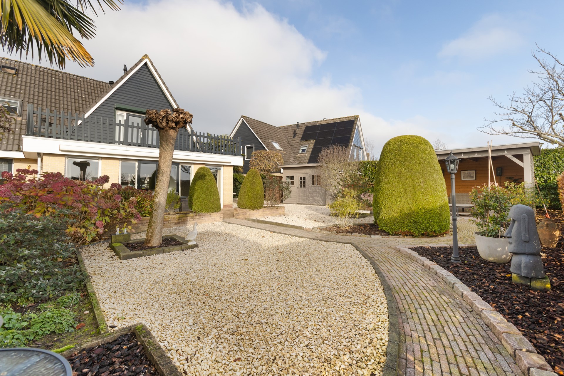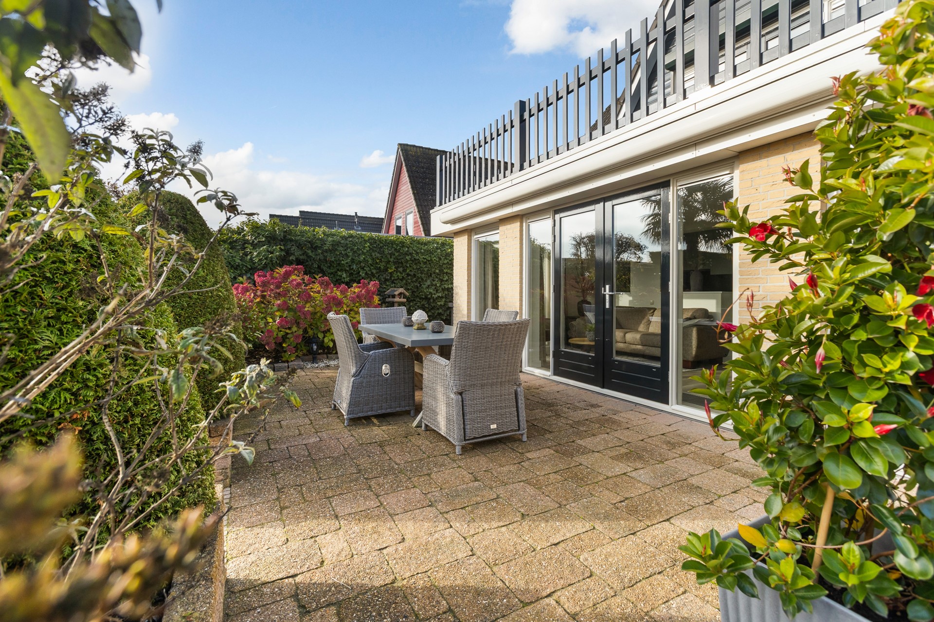 Wanneer je door de straat rijdt, dan valt het niet op, maar wanneer je goed kijkt, dan zie je pas waarin deze woning afwijkt van de andere woningen; Deze woning is (in 2001) op de begane grond maar liefst 3 meter uitgebouwd, daarboven bevindt zich – aansluitend aan de hoofdslaapkamer - een groot en zonnig dakterras.