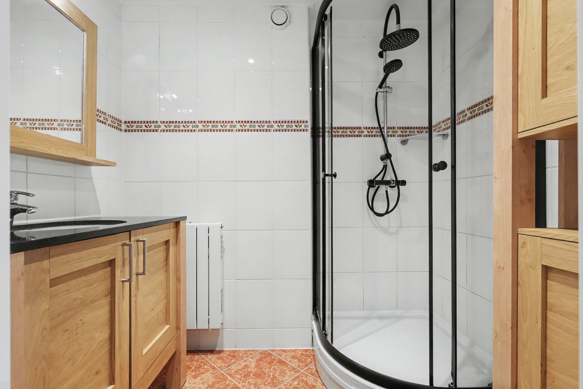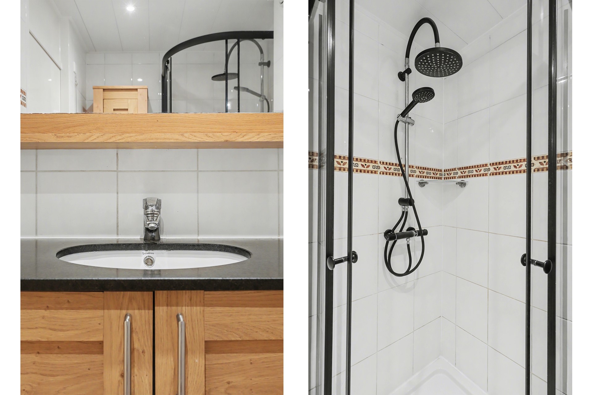 Op de eerste verdieping is de indeling als volgt: overloop, twee prima slaapkamers (3.92 x 3.33 en 3.92 x 2.40) en een verrassend ruime, volledig betegelde badkamer (2.20 x 1.60) met douchecabine, wastafelmeubel, radiator en een verlaagd plafond met inbouwspots.